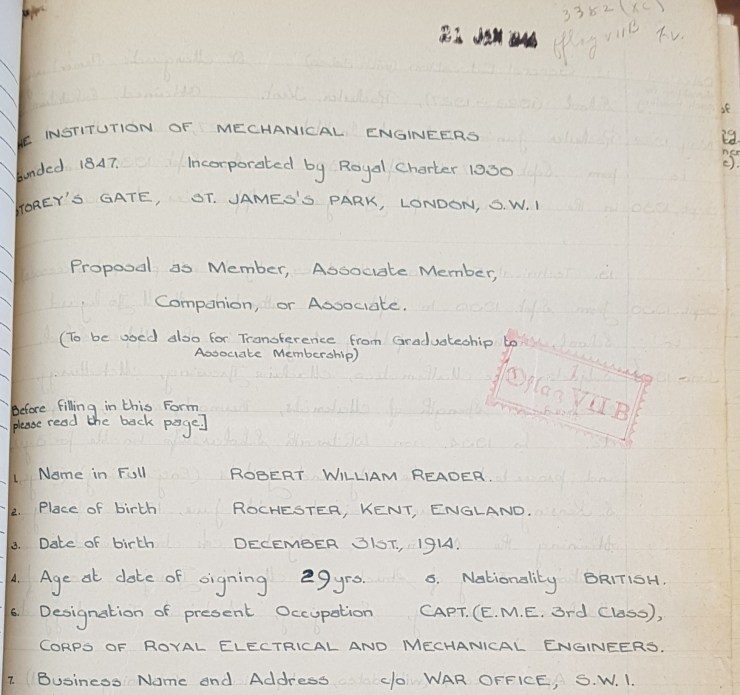 Having passed the required examinations Reader applied and was successfully admitted to the class of Associate Member in May 1944 whilst still a POW in Germany. His handwritten membership proposal form lists his address care of the War Office and was stamped to indicate it had been passed by the camp’s censor.