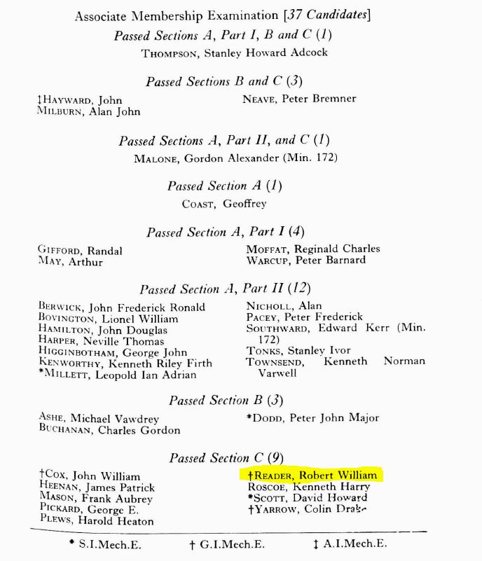 In October 1943, the IMechE Council Minutes recorded Reader as having passed section C (Workshop Organisation and Management) of the Associate Membership examinations taken in April 1943.
