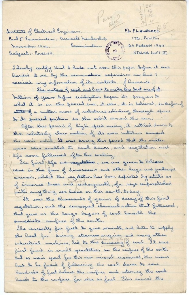 Lawrence completed the paper in 1945, but it didn’t reach the IEE for marking until the following year. He passed, and confirmation of his results was sent via the POW department, as the IEE did not have a current address.
