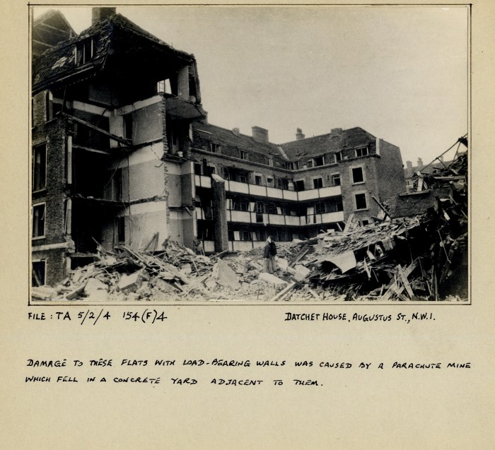 “Damage to these flats with load bearing walls was caused by a parachute mine which fell in a concrete yard adjacent to them.”
